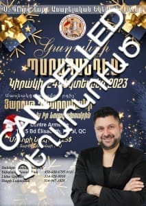 Նախապէս յայտարարած էինք մեր Կաղանդի խնճոյքի երեկոյի նախաձեռնութիւնը Դեկտեմբեր 24ին: Հոգաբարձութիւնս կուգայ ձեր բոլորին տեղեկացնելու, որ սոյն ձեռնարկը չեղարկուած է նկատի ունենալով Արցախի կորուստն ու Արցախահայութեան իրավիճակը: Առ այդ մեր փափաքն է, փոխան ձեռնարկի մուտքի նուէրին, կատարել սրտափուխ Նուիրատուութիւն օժանդակելով Արցախահայութեան կարիքներուն: Կրնաք կապուիլ Եկեղեցւոյ գրասենեակ յաւելեալ տեղեկութիւններու համար կամ կատարելու ձեր նիւթական աջակցութիւնը: Հեռ՝ 450-688-6795 #101